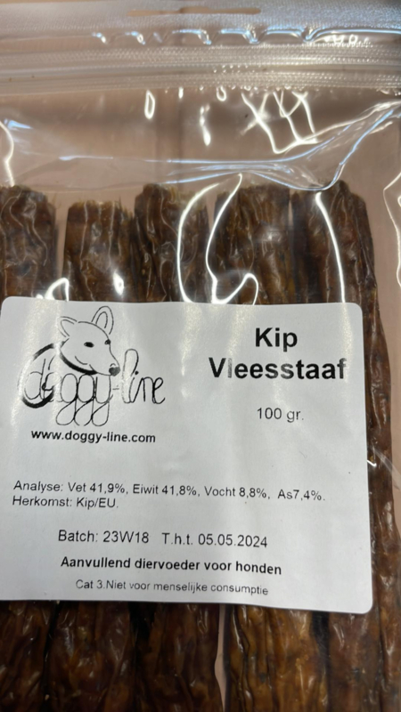 Vleesstaaf kip 100 gramVleesstaaf lengte circa 15 cm. Hardheid = medium